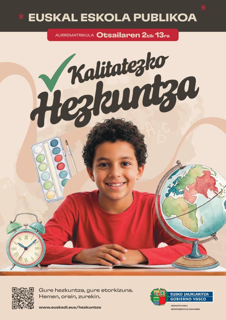 ATE IREKIAK ETA 26-27 IKASTURTERAKO AURREMATRIKULA Feb 1, 2026 Egun hauetan, bigarren hezkuntzako 2026-2027 ikasturteko aurrematrikulak egiteko epea hasiko da. Jarraian, honen inguruko informazio guztia: Aurrematrikula 26-27 ikasturtea GURE IKASTETXEA EZAGUTUEUSKAL ESKOLA PUBLIKOA KARTELA